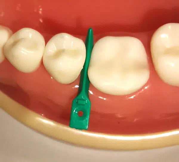 The ski-jump tip protects gingival papillae, sliding in smoothly without trauma.